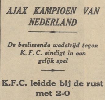 De wedstrijd tussen KFC en Ajax in een uitverkocht Olympisch stadion op donderdag 26 juli 1934 zou de beslissing brengen. Het 1e en 2e doelpunt is voor Van ’t Kaar na gepruts in de Ajax defensie en na twintig minuten staat het 2-0 en leek KFC het landskampioenschap in de zak te hebben. Voor 20.000 toeschouwers speelde KFC sterk maar de druk werd groter en verdiend kwam Ajax middels Mulders in minuut 70 op 2-1. Een heftig Amsterdams offensief drukt de Koogers ver terug en ondanks het bekende kunst en vliegwerk ruiken de spelers de titel. Maar dan twee minuten voor tijd zeilt een Ajax voorzet van 40 meter boven het doelgebied. Ten Have sprint van ver, springt hoog op en kopt het leder boven doelman Jan Veen in het net 2-2. Groot is het verschil tussen vreugde en verdriet. Ajax werd Nederlands kampioen door een beter doelgemiddelde.