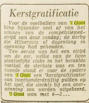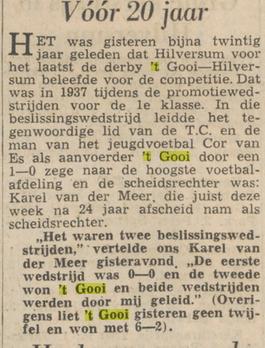 Op 23 december 1956 verslaat ’t Gooi met Pim Bekkering als opvolger van Theo Mosterd voor afgeladen tribunes FC Hilversum met 6-2. De regionale Gooi en Eemlander doet van deze clash een pagina groot verslag. Het is de eerste Hilversumse derby in het profvoetbal en aanwinst Cees Houtveen is met drie goals de man van de wedstrijd. Opnieuw “maar voor hoelang” ging de buidel weer open. Er werd gekozen voor de Amsterdamse trainer Joop de Busser. Doelman Pim Bekkering vertrok naar PSV en keeper Gert Bals en middenvelder Henk de Zoete kwamen over van v.v. Zeist. In de zoektocht naar verborgen talenten vond men een goede breedte versterking in de regio voetballer Cees van Wilpen uit Baarn.